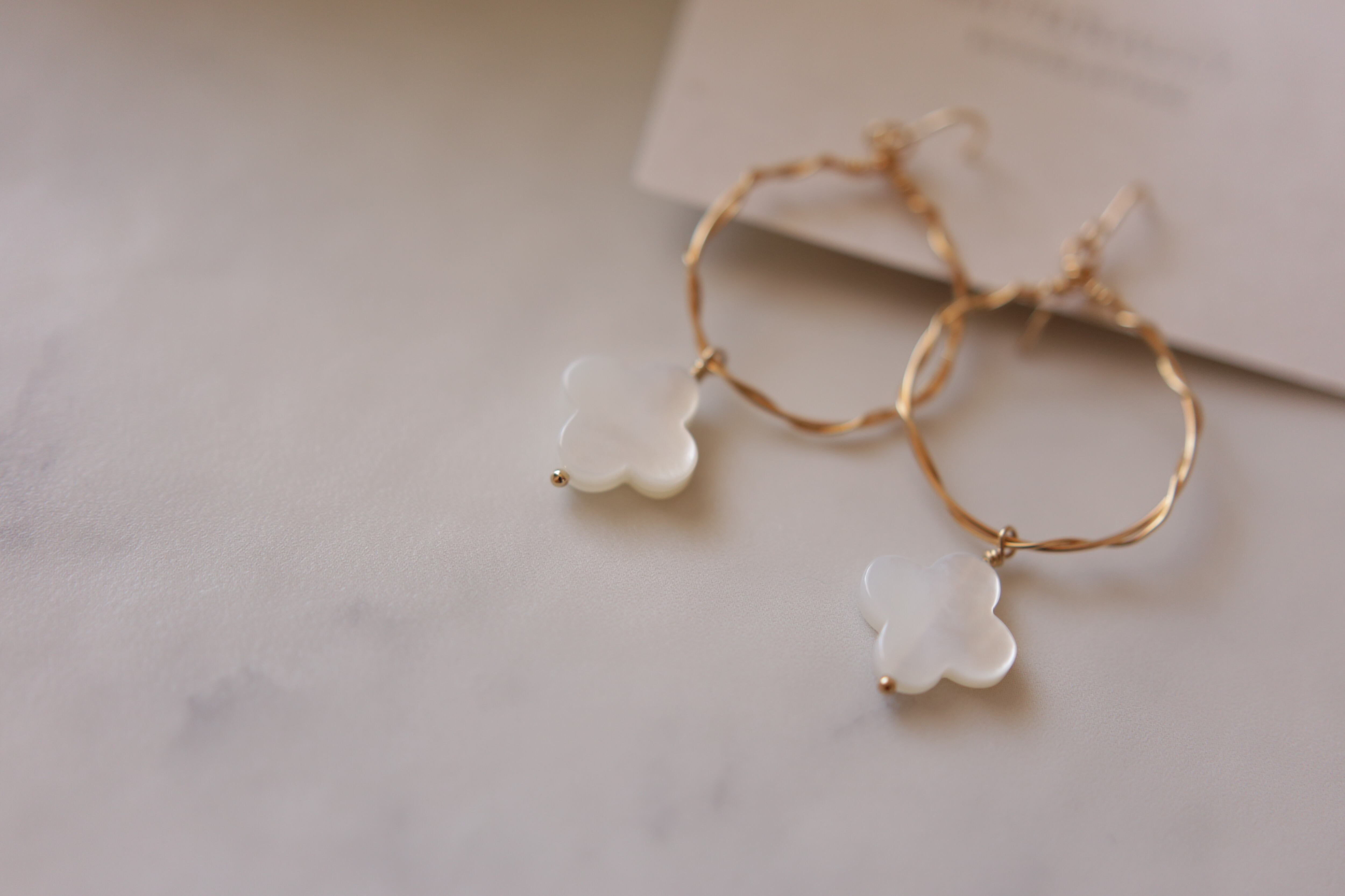 AAAランクの高級ホワイトシェル、フラワー型をボトムにしたピアスです。